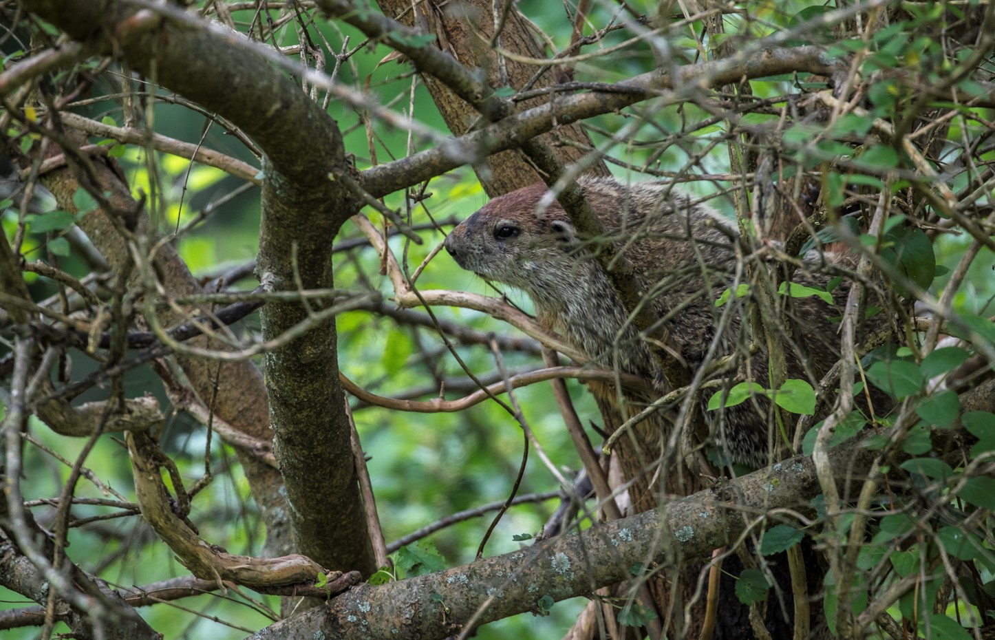 The Groundhog (Marmota monax), also commonly called Woodchuck or Whistle pig, is a large rodent that lives along forest edges and agriculture fields. These critters are powerful excavators as they dig burrows and tunnels underground to live in and hibernate during the cold, winter months. Sometimes their burrows are as deep as 5 feet down and can include up to 45 feet of tunnel segments. These burrows typically have 2 – 5 entrances to help them escape from predators.