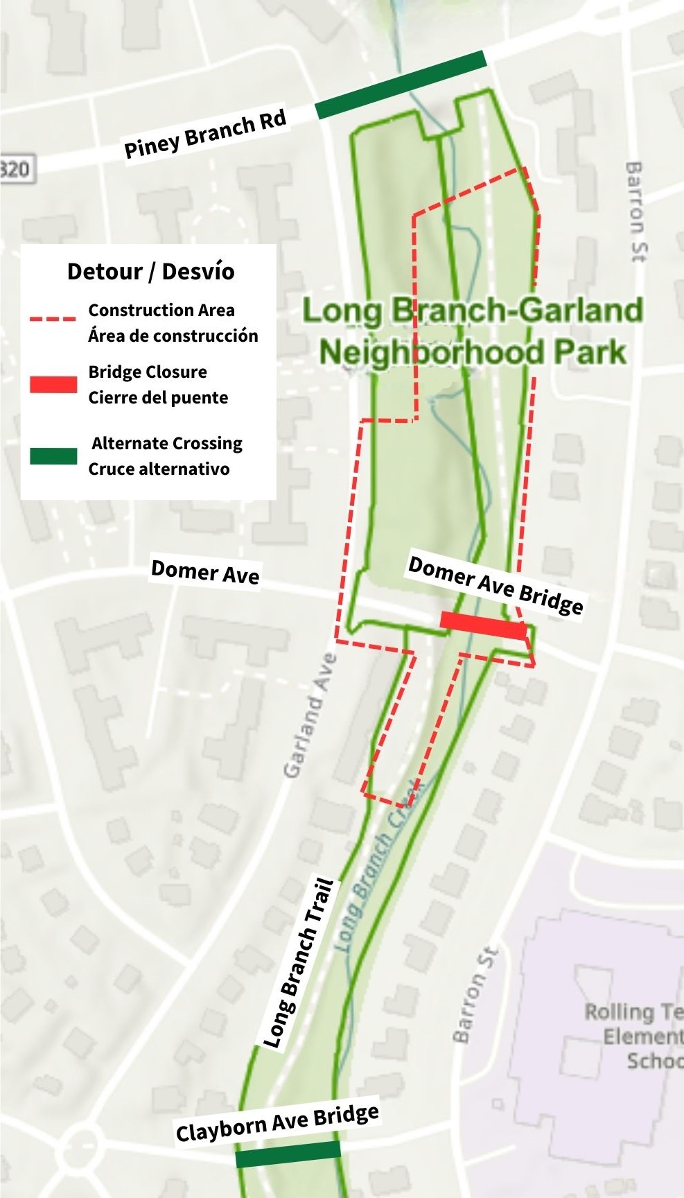 View the detour map. The Long Branch Trail adjacent to both sides of the bridge at Domer Avenue will also be closed. Pedestrians and bicyclists looking to cross Long Branch should consider using the Piney Branch Road sidewalk or the Long Branch Trail bridge at Clayborn Avenue. For families and students reaching to Rolling Terrace Elementary School, please proceed south on Garland Avenue to access the pedestrian bridge at Clayborn Avenue.