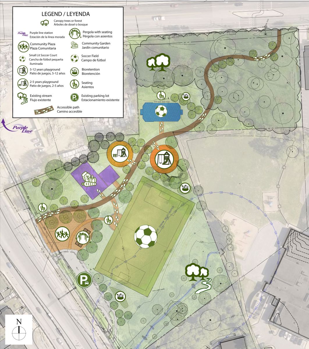 Map of concept 1 “Soccer field” showing the locations of the proposed amenities, such as a refreshed natural grass soccer field, a community plaza, a shaded Pergola with seating, a community garden, two playgrounds designed for different age groups, separated by a walkway, a small soccer court with lighting, and a walking path from University Boulevard to Piney Branch Road.