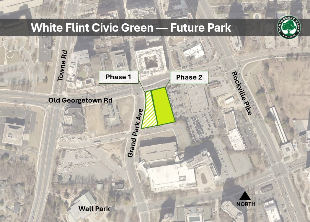 Montgomery Parks has acquired the adjacent property at 11611 Old Georgetown Rd. for Phase 2 of the civic green. When funding is available, Montgomery Parks will demolish the existing building and design and construct Phase 2